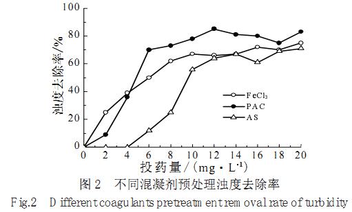 小試試驗 由圖2可知,隨著混凝劑投加量的增加,濁度去除率在逐漸升高,當斜率達到最大值時,繼續增加投藥量,濁度去除率緩慢增高并逐漸趨于平緩。由此可知,混凝劑最佳投藥量:FeCl3為8mg/L,濁度由原來的2.35NTU降為0.9NTU,去除率為62%;PAC為6mg/L,濁度由原來的2.72NTU降為0.82NTU,去除率為70%;AS為12mg/L,濁度由原來的2.52NTU降為0.89NTU,去除率為64%。3種混凝劑均達到最佳投藥量時,PAC對濁度的去除率稍高,FeCl3和AS去除效果相當。