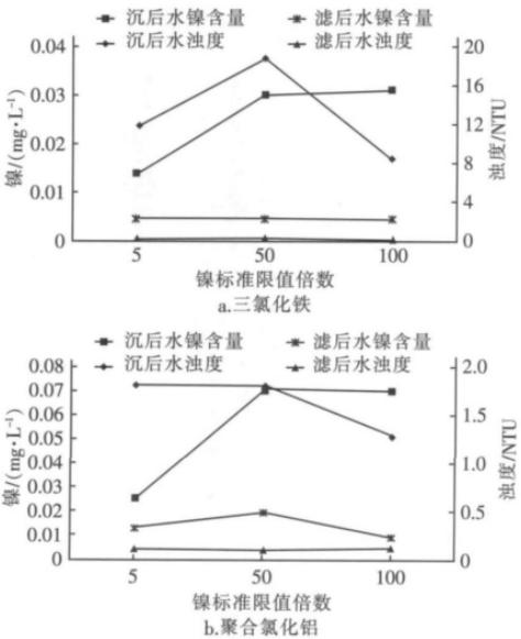 混凝劑PAC化學(xué)沉淀法對重金屬鎳的應(yīng)對能力研究,聚合氯化鋁廠家華泉技術(shù)人員研究發(fā)現(xiàn),混凝前pH值控制在9.30 -9. 73時,可將出水鎳含量降至標(biāo)準(zhǔn)限值以下。考慮到實際生產(chǎn)的可行性及pH值過高會增加回調(diào)的難度,將混凝前原水pH值調(diào)至9.7,在三氯化鐵和PAC的投加量分別為5和7.5 mg/L的條件下,考察了化學(xué)沉淀法對鎳的應(yīng)對能力,結(jié)果如圖5所示。