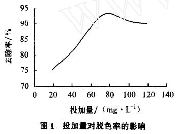 由圖3可看出,在60 - 80 r/min時攪拌速度對絮凝結果影響不大,小于這個范圍則由于水樣和絮凝劑混和不夠充分,反應不完全;大于這個范圍,尤其是超過100 r/min之后,脫色率急劇下降,這是由于攪拌速度過快,使形成的絮團又被打碎,因而絮團非常小,沉降效果很差,絮凝后幾乎不分層,且沉淀時間很長,都會使得絮凝結果不理想。