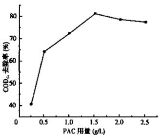 絮凝劑PAC的用量是否合理關(guān)系到沉淀是否徹底、處理是否更有效及生產(chǎn)成本是否更低,因此需要對(duì)此進(jìn)行實(shí)驗(yàn)以準(zhǔn)確確定其用量。實(shí)驗(yàn)所用廢水的CODcr為4480mg/L,根據(jù)實(shí)驗(yàn)方法,在實(shí)驗(yàn)過(guò)程中固定PAM的加入量為10mg/L,pH值為7.0,僅改變絮凝劑PAC的用量。考察絮凝劑PAC用量對(duì)CODcr去除率的影響,實(shí)驗(yàn)結(jié)果見(jiàn)圖1。